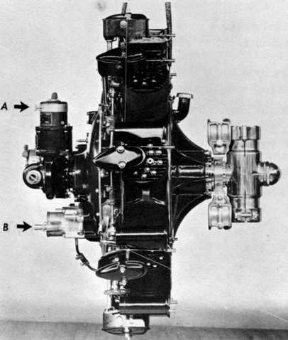 Figure 1 (left).—Front view of first Packard diesel, 1928. Note hoop holding cylinders in place and absence of venturi throttles. This engine was equipped with an air pressure starting system. (Smithsonian photo A2388.)