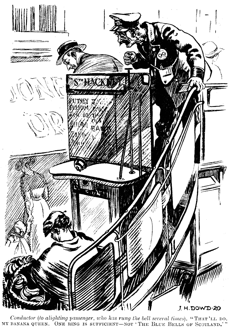 Conductor (to alighting passenger, who has rung the bell several times). "That'll do, my banana queen. One ring is sufficient—not 'The Blue Bells of Scotland.'"