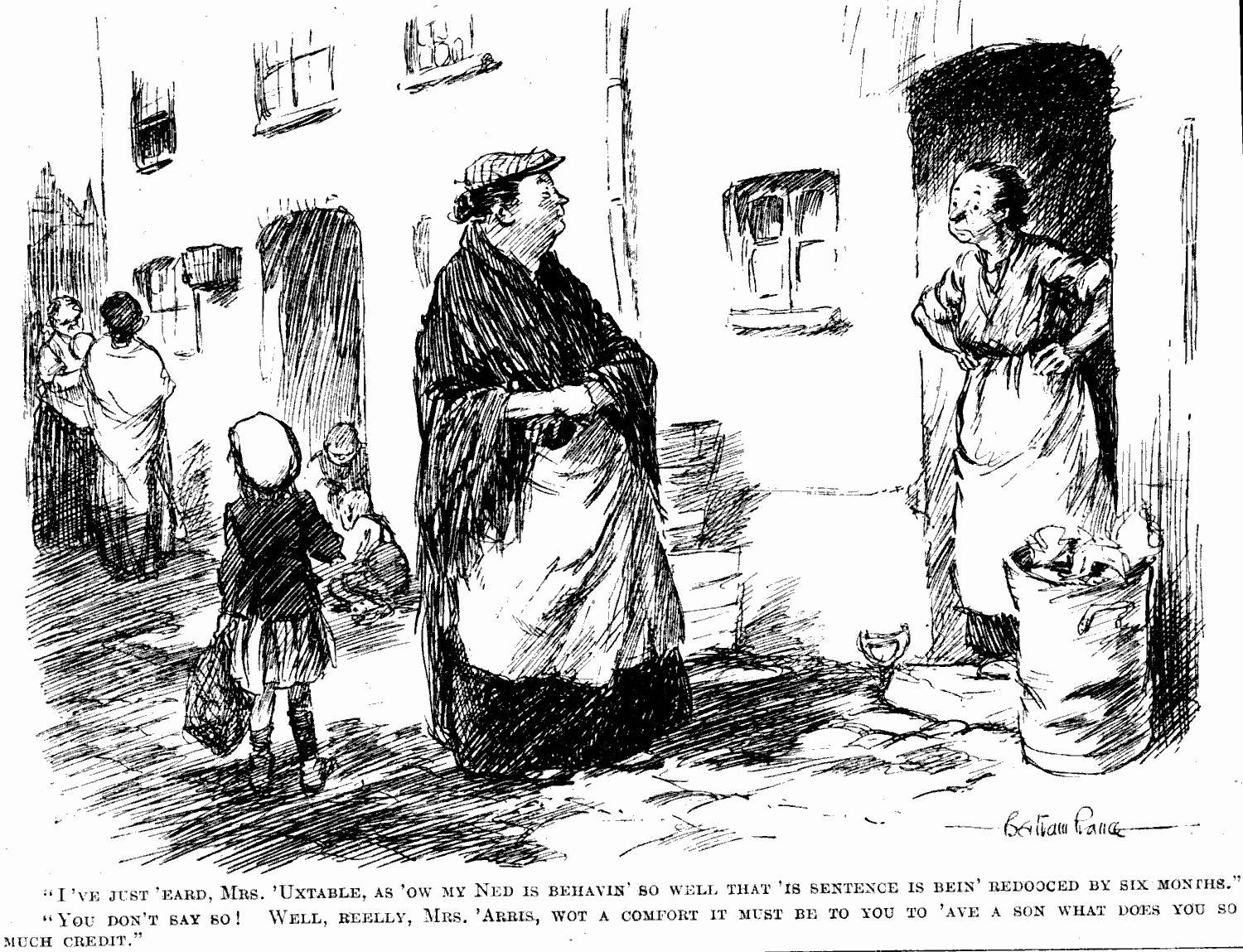"I've just 'eard, Mrs. 'Uxtable, as 'ow my Ned is behavin' so well that 'is sentence is bein' redooced by six months."