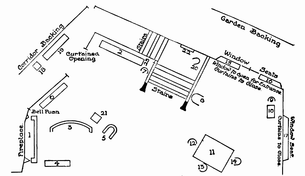 This scene plot indicates how the scene was set at the New Theatre, London. The play can be given, of course, without a staircase.