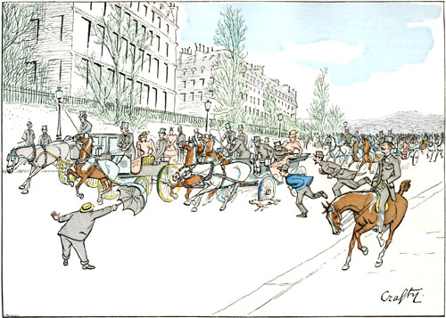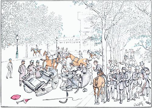 Le choc attendu s'est produit. Un fiacre négligemment conduit, cela s'est vu, débouchant de la rue de Presbourg, n'a pas eu le temps d'éviter l'avalanche à quatre roues qui roulait vers lui. La roue de derrière du char emporté (elle s'est rompue du coup) a heurté la sienne de telle sorte que les deux véhicules se sont trouvés instantanément arrêtés. Le fiacre, plus léger, a été précipité sur le côté, pendant que son cocher a été lancé sur la contre-allée. Des âmes charitables s'occupent d'extirper des flancs de la boîte endommagée ses infortunés habitants.—Un médecin, il s'en trouve toujours dans ces cas-là, prodigue ses soins à la propriétaire de la victoria, qu'on a transportée sur une chaise Tronchon. Pendant ce temps son compagnon cherche à égarer la religion du représentant de l'autorité en lui faisant de l'accident un récit singulièrement inexact, tendant à rejeter sur le cocher du fiacre, rendu muet par de nombreuses contusions, toute la responsabilité de la rencontre et de ses suites.