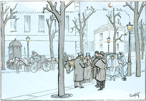 Il s'agit d'un grave problème.—Le tarif de nuit est-il applicable quand on arrive à domicile après minuit et demi, ou bien est-il nécessaire que le cocher ait été pris après cette heure pour avoir le droit d'en réclamer le prix? Dans la circonstance actuelle, le cocher prétend le contraire, le bourgeois affirme qu'il ne doit que la course ordinaire, les agents sont dans une extrême perplexité, et la partie féminine du chargement du fiacre se morfond en attendant la solution du conflit.