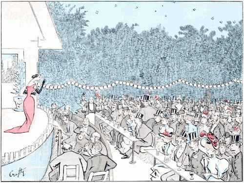 Il a fait une chaleur sénégalienne pendant tout l'après-midi. Pas une place n'est inoccupée. C'est d'ailleurs le moment où l'étoile apparaît en scène, et, même les jours où le temps est exécrable, ses nombreux fidèles font à cette heure psychologique une apparition plus ou moins longue.—Elle n'a pas encore ouvert la bouche, mais elle est apparue, et il n'en faut pas davantage pour que toutes les physionomies respirent la béatitude complète.