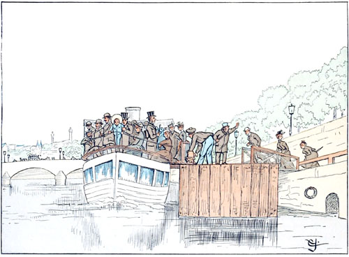 L'esquif touche au ponton, et l'employé qui préside au contrôle de ces omnibus aquatiques se prépare à donner le signal du départ. Cependant toute une famille échelonnée sur le quai se hâte lourdement,—le père est déjà sur le ponton et encourage les siens de la voix et du geste,—la fille atteint la passerelle, mais la mère à bout de souffle est encore sur la terre ferme, et ses chances d'embarquement paraissent singulièrement compromises.
