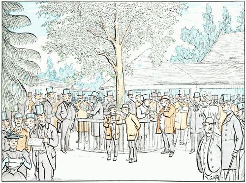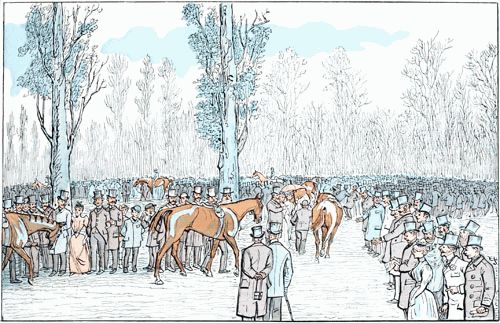 C'est le rendez-vous des connaisseurs ou soi-disant tels. On examine chacun des concurrents, et, d'après son aspect, on se décide à parier pour lui ou à attendre une meilleure occasion. Généralement cet examen, forcément superficiel, n'apprend rien aux spectateurs, mais la plupart d'entre eux demeurent convaincus qu'il est essentiel pour la sage confection de leurs paris.