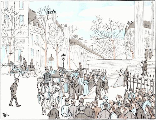 La foule est généralement sympathique aux mariages. L'heure à laquelle ils s'accomplissent coïncide généralement avec celle du déjeuner des modistes et autres couturières du quartier, que leur manque de dot maintient à l'état de célibataires sans leur enlever le désir et l'espérance de monter en grade. Elles constituent le fonds des spectateurs, et leurs connaissances spéciales leur permettent d'estimer avec exactitude les ressources probables des nouveaux conjoints et de leur entourage.