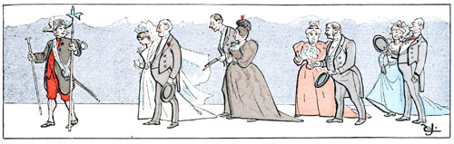 C'est le moment où les compliments s'accumulent.—Si la moitié des éloges qui se décernent à cette minute étaient mérités, il n'y aurait que d'heureuses unions. Malheureusement ces dithyrambes ne sont pas toujours sincères, et c'est ce qui explique que les tribunaux accordent quelquefois le divorce à des gens qui ne sont pas parvenus à s'entendre.