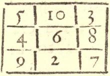 The Magic Square is when Numbers in Arithmetical Proportion are dispos’d into such Parallels or equal Ranks, as that the Sums of each Row as well Diagonally as Laterally shall be all equal; for Example, 2, 3, 4, 5, 6, 7, 8, 9, 10. Place these Nine in a Square of three, they will directly and diagonally make 18. Thus,
