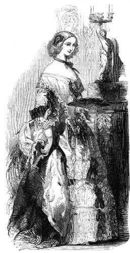 Fig. 2. Bridal Dress for the Marriage Ceremony.—Robe of white poult de soie. The skirt very full, and ornamented in front with five rows of lace, finished at each end with bows of white satin. The rows of lace are of graduated lengths, the lower row being about a quarter and a half long, and the upper one not more than five or six inches. The corsage is high at the back, but open in front nearly as low as the waist, and edged round with a fall of lace, narrowing to a point in front. Within the corsage is worn a chemisette, composed of rows of lace falling downward, and finished at the throat by a band of insertion and an edging standing up. The sleeves are demi-long and loose at the lower part, and the under-sleeves are composed of three broad rows of lace. The hair in waved bandeaux on the forehead, and the back hair partly plaited and partly curled, two long ringlets dropping on each side of the neck. Wreath of orange blossom, jasmine, and white roses. Long bridal vail of Brussels net.[Pg 288]