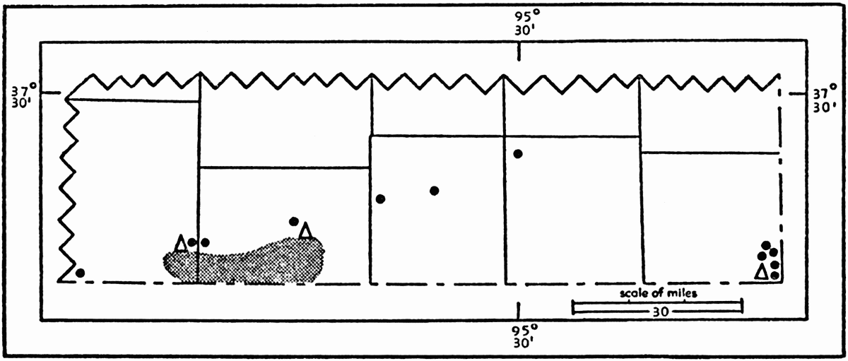 [Pg 103] Osgood (1909:149) recorded the subspecies P. b. attwateri from Cedar Vale, Chautauqua County, Kansas, but the specimen from there must now be assigned to cansensis on geographic grounds. Probably the specimen was not obtained from Cedar Vale itself for the habitat is not suitable there. Numerous specimens are known from 3 mi. W Cedar Vale, in Cowley County, Kansas, all of which are assigned to cansensis. Osgood's recorded locality is situated between this locality and the type locality of cansensis, which is 4 mi. E Sedan, Chautauqua County, Kansas. The distribution of cansensis also is shown in Fig. 1.