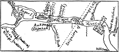 It in not necessary to discuss at length the origin of the Indians who lived on the banks of the St. John at the time the country became known to Europeans. Whether or not the ancestors of our Indians were the first inhabitants of that region it is difficult to determine. The Indians now living on the St. John are Maliseets, but it is thought by many that the Micmacs at one time, possessed the valley of the river and gradually gave place to the Maliseets, as the latter advanced from the westward. There is a tradition among the St. John river Indians that the Micmacs and Maliseets were originally one people and that the Maliseets after a while “went off by themselves and picked up their own language.” This the Micmacs regarded as a mongrel dialect and gave to the new tribe the name Maliseet (or Milicete), a word derived from Mal-i-see-jik—“he speaks badly.” However, in such matters, tradition is not always a safe guide. It is more probable the two tribes had an independent origin, the Micmacs being the earlier inhabitants of Acadia, while the Maliseets, who are an offshoot of the Abenaki (or Wabenaki) nation, spread eastward from the Kennebec to the Penobscot and thence to the St. John. The Indians who are now scattered over this area very readily understand one another’s speech, but the language of the Micmacs is unintelligible to them.