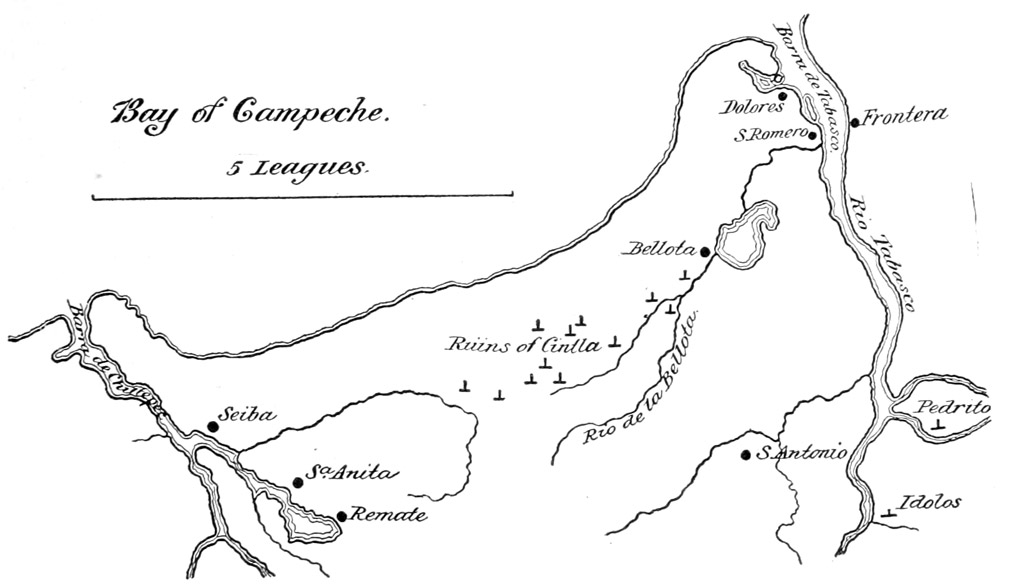 But what is conclusive is that in 1525 the Spaniards founded the city Nuestra Señora de la Victoria, on the site of Potonchan. In 1646, it had a cura and a vicar, and counted 2000 parishioners, and the abundance of its cacao harvest is especially noted.7-2 At some later day it was attacked and destroyed by filibusters; but the remains of the church and the cemetery are still visible at Dolores, and pilgrimages are yet made to them on certain holy days by the faithful of the parish of Frontera, on the opposite shore. This record places the scene of the conflict beyond all doubt.
