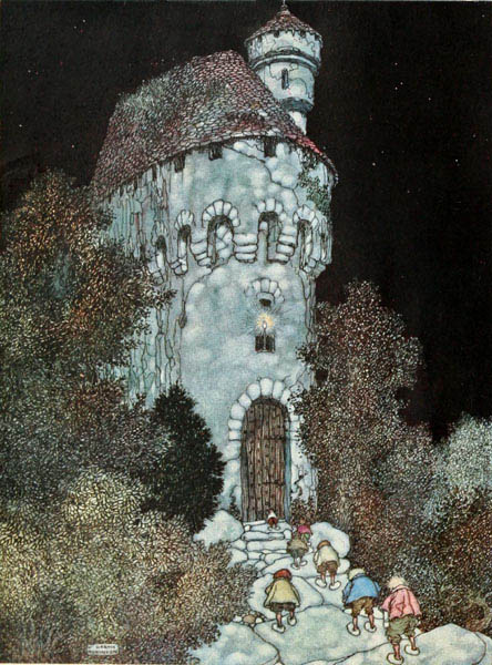 A grand christening was held, and all the fairies that could be found in the realm (they numbered seven in all) were invited to be godmothers to the little princess. This was done so that by means of the gifts which each in turn would bestow upon her (in accordance with the fairy custom of those days) the princess might be endowed with every imaginable perfection.