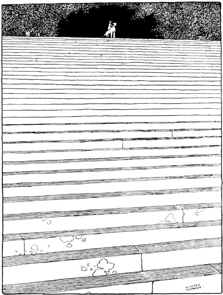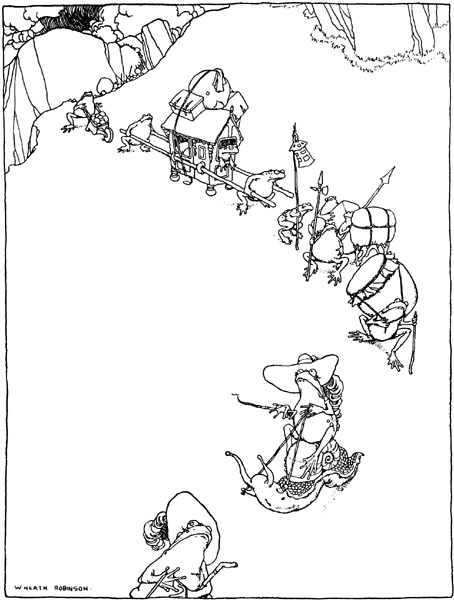 A hundred carriages had been sent to the water's edge by the king. These were drawn by animals of every kind—lions, bears, stags, wolves, horses, oxen, asses, eagles, and peacocks. The carriage in which Princess Rosette was to be borne was drawn by six blue monkeys which could leap and dance upon the tight-rope and perform endless amusing antics; these had trappings of crimson velvet, studded with gold plates.