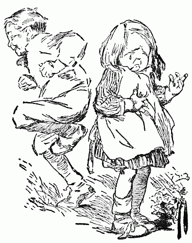 When the tin pail was about full an accident happened to Margery. She stepped into something soft and clayey, and the next instant, seeing what it was, she started off by leaps and bounds, crying out the shrill warning: "Run, Willie, run! Bumble bees! I stepped on a bumble bee nest!"