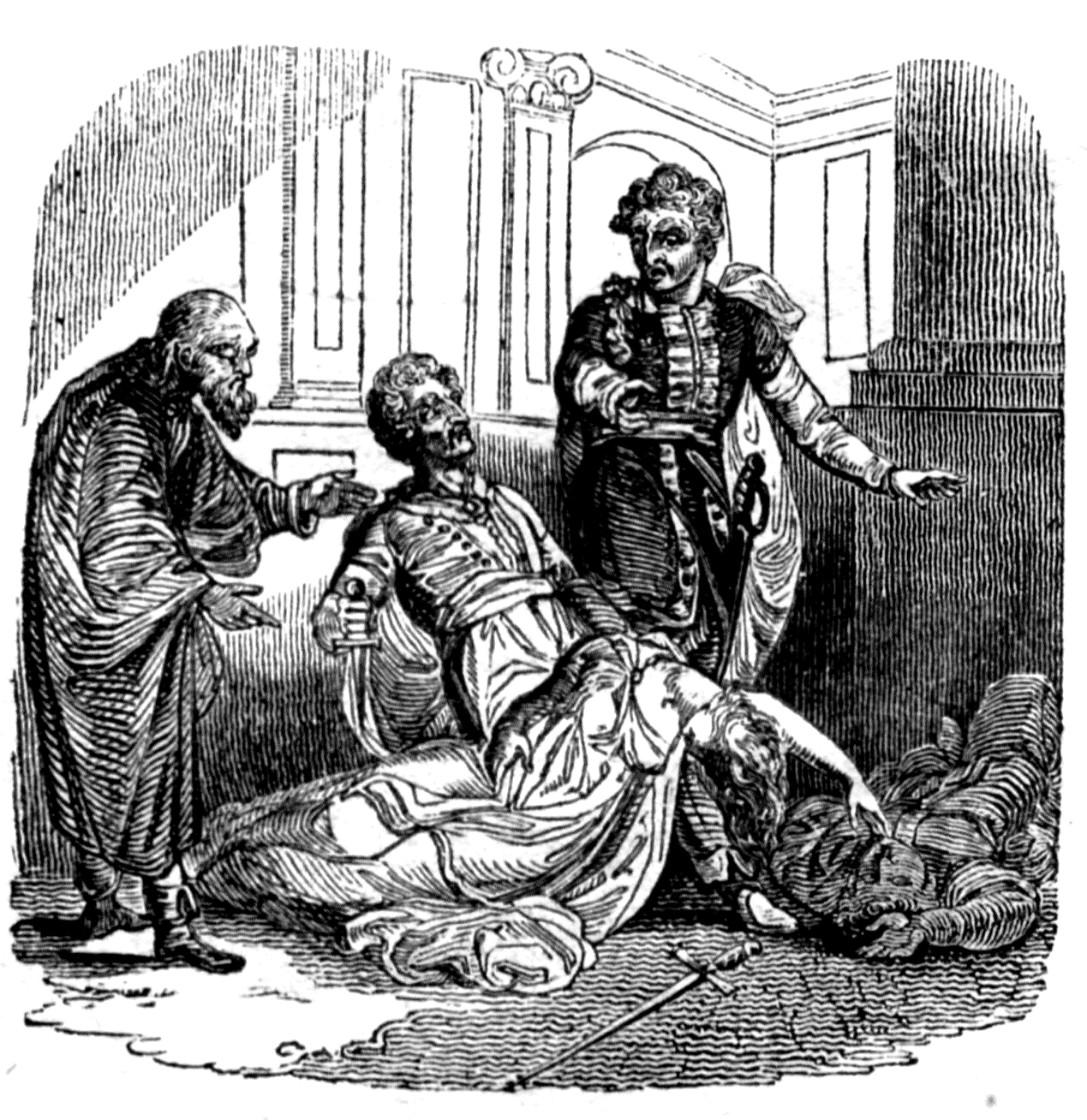 | [Acasto faints into the arms of a Servant. |