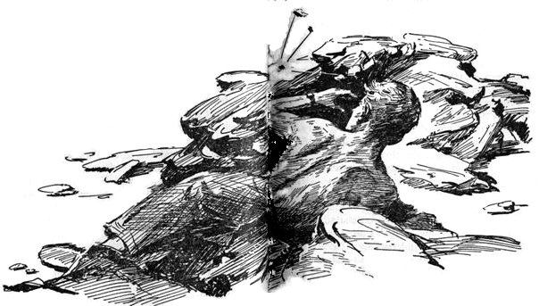 Scotty selected one of the larger ones, then checked his sling. The sling was simplicity itself. Two pieces of strong cord were connected to each side of the pouch, made of heavy canvas about four inches long and three wide. One string ended in a loop, which Scotty slipped over his right forefinger. The other string ended in a large knot, which Scotty held between his forefinger and thumb.