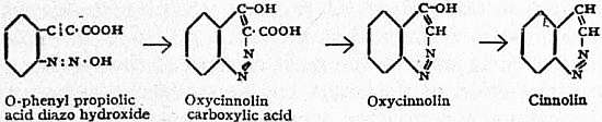 CINNOLIN, C8H6N2, a compound isomeric with phthalazine, prepared by boiling dihydrocinnolin dissolved in benzene with freshly precipitated mercuric oxide. The solution is filtered and the hydrochloride of the base precipitated by alcoholic hydrochloric acid; the free base is obtained as an oil by adding caustic soda. It may be obtained in white silky needles, melting at 24-25°C. and containing a molecule of ether of crystallization by cooling the oil dissolved in ether. The free base melts at 39°C. It is a strong base, forming stable salts with mineral acids, and is easily soluble in water and in the ordinary organic solvents. It has a taste resembling that of chloral hydrate, and leaves a sharp irritation for some time on the tongue; it is also very poisonous (M. Busch and A. Rast, Berichte, 1897, 30, p. 521). Cinnolin derivatives are obtained from oxycinnolin carboxylic acid, which is formed by digesting orthophenyl propiolic acid diazo chloride with water. Oxycinnolin carboxylic acid on heating gives oxycinnolin, melting at 225°, which with phosphorus pentachloride gives chlorcinnolin. This substance is reduced by iron filings and sulphuric acid to dihydrocinnolin.