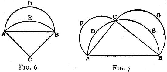 The form of a circle is familiar to all; and we proceed to define certain lines, points, &c., which constantly occur in studying its geometry. The fixed point in the preceding definition is termed the “centre” (C in fig. 1); the constant distance, e.g. CG, the “radius.” The curve itself is sometimes termed the “circumference.” Any line through the centre and terminated at both extremities by the curve, e.g. AB, is a “diameter”; any other line similarly terminated, e.g. EF, a “chord.” Any line drawn from an external point to cut the circle in two points, e.g. DEF, is termed a “secant”; if it touches the circle, e.g. DG, it is a “tangent.” Any portion of the circumference terminated by two points, e.g. AD (fig. 2), is termed an “arc”; and the plane figure enclosed by a chord and arc, e.g. ABD, is termed a “segment”; if the chord be a diameter, the segment is termed a “semicircle.” The figure included by two radii and an arc is a “sector,” e.g. ECF (fig. 2). “Concentric circles” are, as the name obviously shows, circles having the same centre; the figure enclosed by the circumferences of two concentric circles is an “annulus” (fig. 3), and of two non-concentric circles a “lune,” the shaded portions in fig. 4; the clear figure is sometimes termed a “lens.”