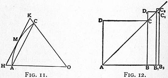 The circle was undoubtedly known to the early civilizations, its simplicity specially recommending it as an object for study. Euclid defines it (Book I. def. 15) as a “plane figure enclosed by one line, all the straight lines drawn to which from one point within the figure are equal to one another.” In the succeeding three definitions the centre, diameter and the semicircle are defined, while the third postulate of the same book demands the possibility of describing a circle for every “centre” and “distance.” Having employed the circle for the construction and demonstration of several propositions in Books I. and II. Euclid devotes his third book entirely to theorems and problems relating to the circle, and certain lines and angles, which he defines in introducing the propositions. The fourth book deals with the circle in its relations to inscribed and circumscribed triangles, quadrilaterals and regular polygons. Reference should be made to the article Geometry: Euclidean, for a detailed summary of the Euclidean treatment, and the elementary properties of the circle.