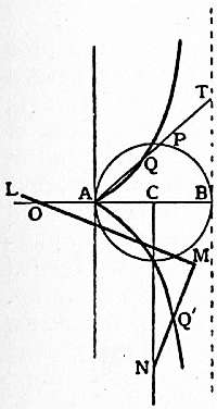 In the article Geometry: Analytical, it is shown that the general equation to a circle in rectangular Cartesian co-ordinates is x2 + y2 + 2gx + 2fy + c = 0, i.e. in the general equation of the second degree the co-efficients of x2 and y2 are Cartesian co-ordinates. equal, and of xy zero. The co-ordinates of its centre are -g/c, -f/c; and its radius is (g2 + f2 - c)½. The equations to the chord, tangent and normal are readily derived by the ordinary methods.