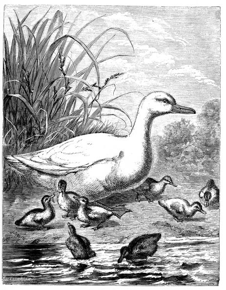 I confess I did not at all expect to hear from you; for I always believed you to be one of those thoughtless young creatures which are to be found in other stations of life as well as in yours and mine, who, as soon as they get fledged and able to get abroad, care no more for their parents and those who brought them up than I care for a shower of rain. However, you have escaped danger twice, and you have reason to congratulate yourself. I have been sitting here upon ten eggs for three weeks past, and of course have another week to be confined; but then the thoughts of the pleasure I shall have in hatching and guiding my young ones to the water, is ample payment for all my pains. They will look so clean and so delighted, and will do as they are bid by the smallest quack that I can utter, that I must be a bad mother indeed if I am not proud of them. Perhaps you will wonder when I tell you that we have a creature here—fledged indeed—which is called a hen; a strange, cackling, flying, useless, noisy, silly creature, which is as much afraid of water as you are of your decoy.