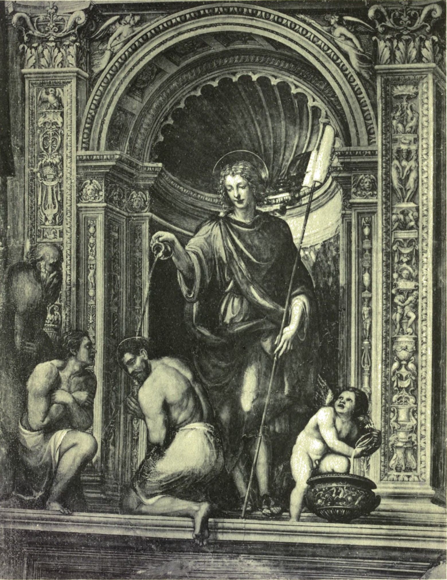 Likewise a Veronese is Paolo Farinato, an able painter, who, after having been a disciple of Niccolò Ursino,[12] has executed many works at Verona. The most important are a hall in the house of the Fumanelli, which he filled with various scenes in fresco-colours at the desire of Messer Antonio, a gentleman of that family, most famous as physician over all Europe, and two very large pictures in the principal chapel of S. Maria in Organo. In one of these is the story of the Innocents, and in the other is the scene when the Emperor Constantine causes a number of children to be brought before him, intending to kill them and to bathe in their blood, in order to cure himself of his leprosy. Then in the recess of that chapel are two pictures, large, but smaller than the others, in one of which is Christ receiving S. Peter, who is walking towards Him on the water, and in the other the dinner that S. Gregory gives to certain poor men. In all these works, which are much to be extolled, is a vast number of figures, executed with good design, study, and diligence. By the hand [Pg 241] of the same master is an altar-picture of S. Martino that was placed in the Duomo of Mantua, which he executed in competition with others his compatriots, as has just been related.