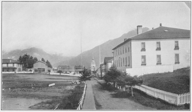 Continuing east along Lincoln Street a short distance beyond the Cathedral a vacant space on the right marks the spot formerly occupied by the clubhouse, built by Etolin for a home for the clerks, navigators, and other employes of the Company–opposite it was situated the foundry and machine shops, while a little farther to the east stood the sawmills, at the mouth of the outlet to Swan Lake. Along this stream was the eastern boundary of the stockade of the Russian fort, with a blockhouse near the point of the lower end of the lake. East of this stockade were the kitchen gardens, but all traces of them have long since vanished. Continuing along the street following the shore, the Bishop’s house is passed on the left, where the Russian school is taught, and a short distance beyond is the house of the Episcopal Bishop of the diocese, Rev. Bishop P. T. Rowe. Still farther to the east is the Sheldon Jackson School, the Presbyterian Mission School, consisting of a group of buildings, the first of which was completed 97 in 1880, under the superintendence of Rev. Alonzo Austin, and others have been added from time to time until the present fine establishment has resulted. An octagonal structure shelters the Sheldon Jackson Museum, a fine collection of native work of many kinds, gathered from all parts of Alaska by the first superintendent of native schools for the Territory. A small paper is published by the mission, the Verstovian, and is printed by the native students of the institution.