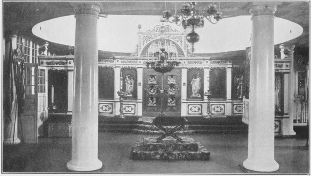 Across the street is the Cathedral of St. Michael, the headquarters of the Greek Orthodox Church in Alaska. In the Territory are claimed to be ten thousand communicants of that faith and from Sitka the management of affairs is conducted. The church is in the form of a cross and is surmounted by the Greek cross. The interior is richly decorated after the usual custom of the Russian churches. Candlesticks of 96 massive design stand at either side of the doors of the inner sanctuary. The building, with its dome, is distinctive, and is a good example of Russian church architecture.[30]