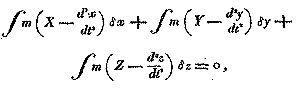 Les questions relatives au mouvement étant ainsi généralement réduites, de la manière la plus simple possible, à de pures questions d'équilibre, la méthode la plus philosophique pour traiter la dynamique rationnelle consiste à combiner le principe de d'Alembert avec le principe des vitesses virtuelles, qui fournit directement, comme nous l'avons vu dans la leçon précédente, toutes les équations nécessaires à l'équilibre d'un système quelconque. Telle est la combinaison conçue par Lagrange, et si admirablement développée dans sa Mécanique analytique, qui a élevé la science générale de la mécanique abstraite au plus haut degré de perfection que l'esprit humain puisse ambitionner sous le rapport logique, c'est-à-dire à une rigoureuse unité, toutes les questions qui peuvent s'y rapporter étant désormais uniformément rattachées à un principe unique, d'après lequel la solution définitive d'un problème quelconque ne présente plus nécessairement que des difficultés analytiques. Pour établir le plus simplement possible la formule générale de la dynamique, concevons que toutes les forces accélératrices du système quelconque proposé aient été décomposées parallèlement aux trois axes des coordonnées, et soient X, Y, Z, les groupes de forces correspondant aux axes des x, y, z; en désignant par m la masse du système, il devra y avoir équilibre, d'après le principe de d'Alembert, entre les quantités primitives de mouvement mX, mY, mZ, et les quantités de mouvement effectives prises en sens contraire, qui seront évidemment exprimées par