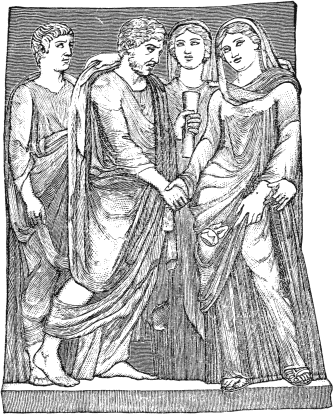 The bride is taken, to all appearances, by force from her mother’s embrace,—a survival of the marriage by capture, or, as the Romans themselves put it, a reminiscence of the Sabine marriage. The mustaceum, or wedding cake, is eaten, and the procession begins, all singing the wedding hymn. The groom throws nuts to the boys in the street as a sign that he will now put away childish things. Arriving at the groom’s house, the bride anoints the doorposts with oil to signify health and plenty, and then offers a prayer for future happiness.