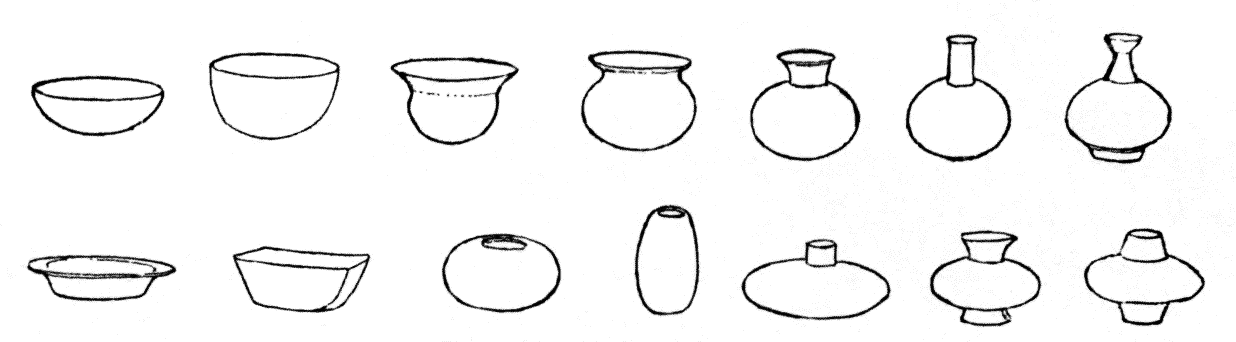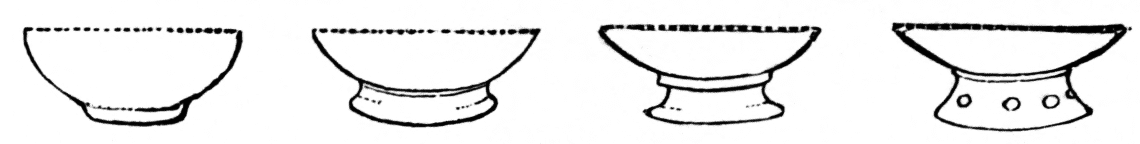 Compound vessels are rather rare, nearly all of the varieties being outlined in Fig. 428. Some of these are formed by uniting two or even three simple forms in one. Others are only partially compound and resemble the askoidal shapes of Greek art. Attention will be called to the probable origin of all these shapes elsewhere.