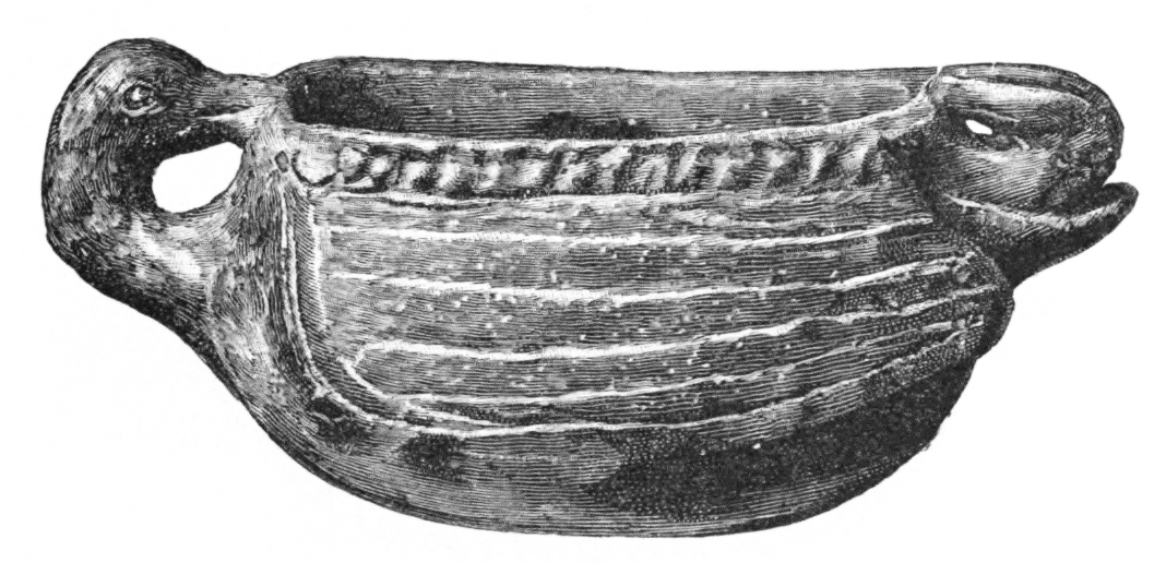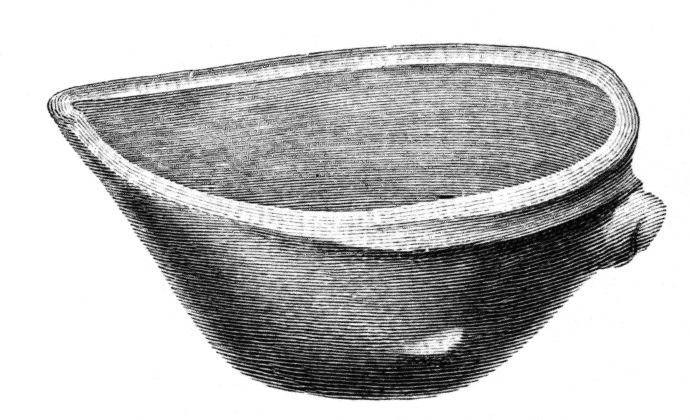 In connection with the teapot-like vessels it will be well to describe another novel form not wholly unlike them in appearance, an example [page 404] being shown in Fig. 414. The shoulder is elongated on opposite sides into two curved, horn-like cones, which give to the body a somewhat crescent-shaped outline. It is of the ordinary plain, dark ware, and has had a low stand or base which is now broken away.