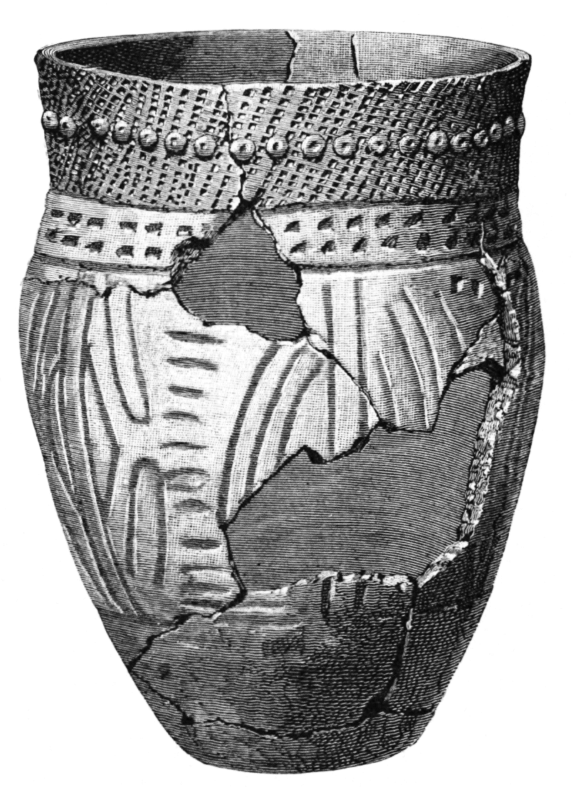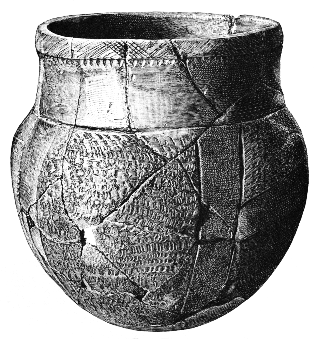 On the shelves of our museums the difference between the two great families of the middle and Upper Mississippi are strikingly manifest. The ware of the former district, as already shown, exhibits variously tinted pastes tempered with coarsely pulverized shells or potsherds; the vases, as a rule, having full bodies, well rounded bases, and in very many cases, narrow necks. They exhibit great variety of decoration and no little care in finish. The northern family shows a dark paste tempered with sand, often apparently granitic; a rough fracture, and generally a rude finish. The shapes are comparatively simple, often long, tapering below, and flat bottomed. The ornamentation is totally unlike that of the southern variety. It consists of cord impressions, incised lines, and implement indentations arranged in figures peculiar to the district. There are many other features that, like the subtile characters of human physiognomy, cannot easily be described, but which are of first importance as indices of relationship or the lack of it.
