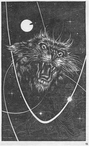 "If there is, I don't know—What the hell, Buster?" The cat which had been lying in his lap, suddenly leaped to the floor. Tail extended, crouched, eyes alert, the cat seemed to be trying to follow the flight of something through the air above him.