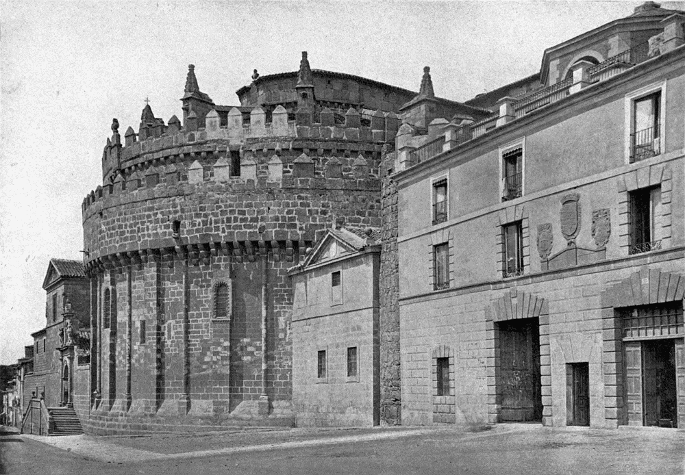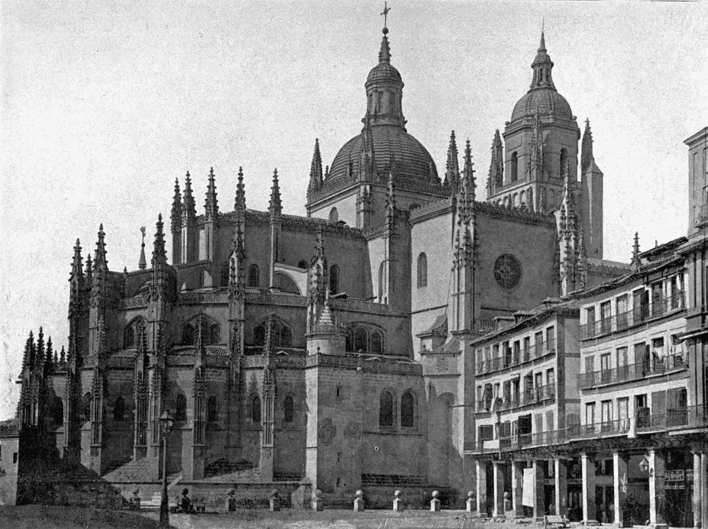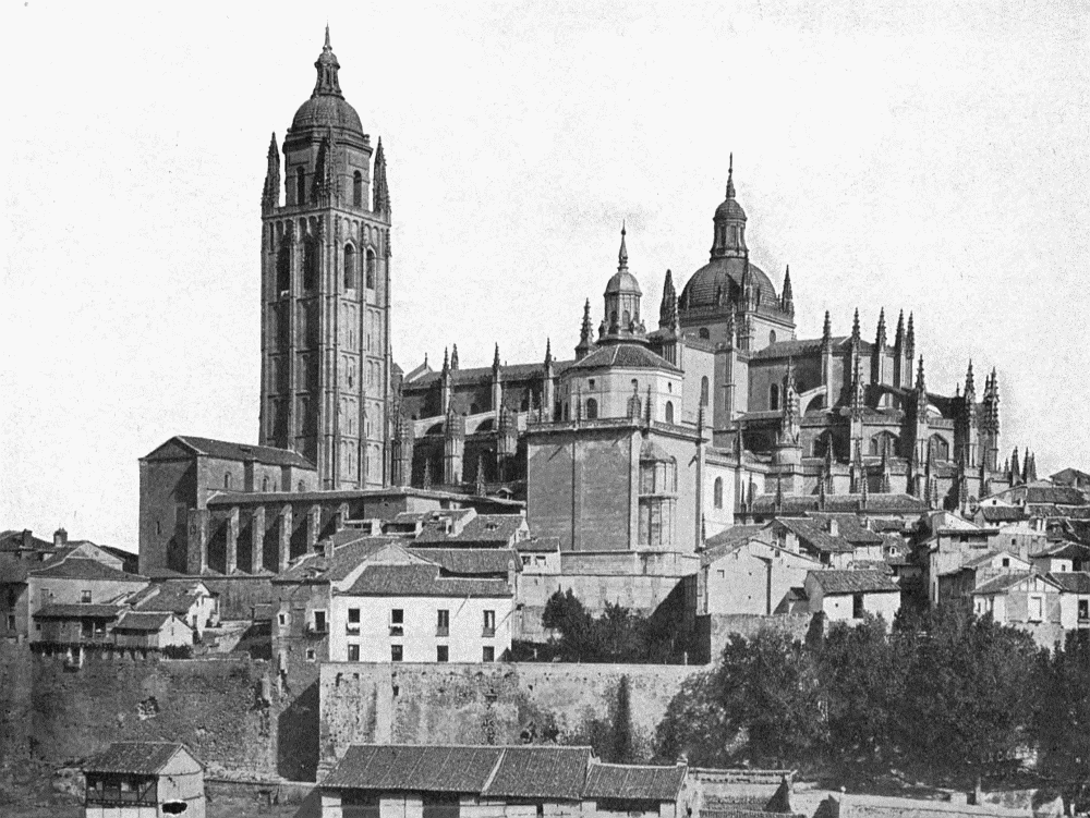 The Cathedral stands upon one of the hills of the old city. The exact date of its inception, as well as the name of the original architect, is doubtful, but it is certain that it was begun not long after the year 1100. At Jeronimo's death it could not have been{9} far advanced, but the crossing and the Capilla Mayor could be consecrated and employed for services in the middle of the century, and the first cloisters were built soon after. The nave and side aisles followed, their arches being closed in the middle of the thirteenth century. The lantern was probably placed over the crossing as late as the year 1200. Following an order inverse to that pursued by later Gothic architects, the Romanesque builders finished their work with the eastern end.