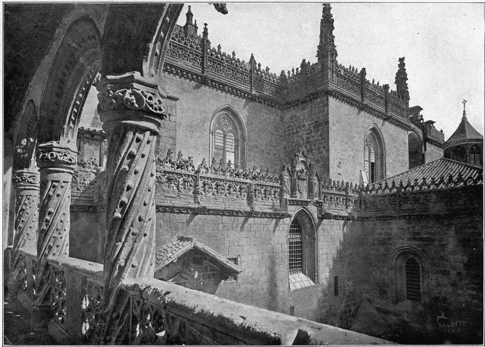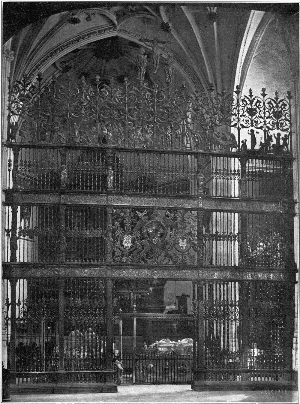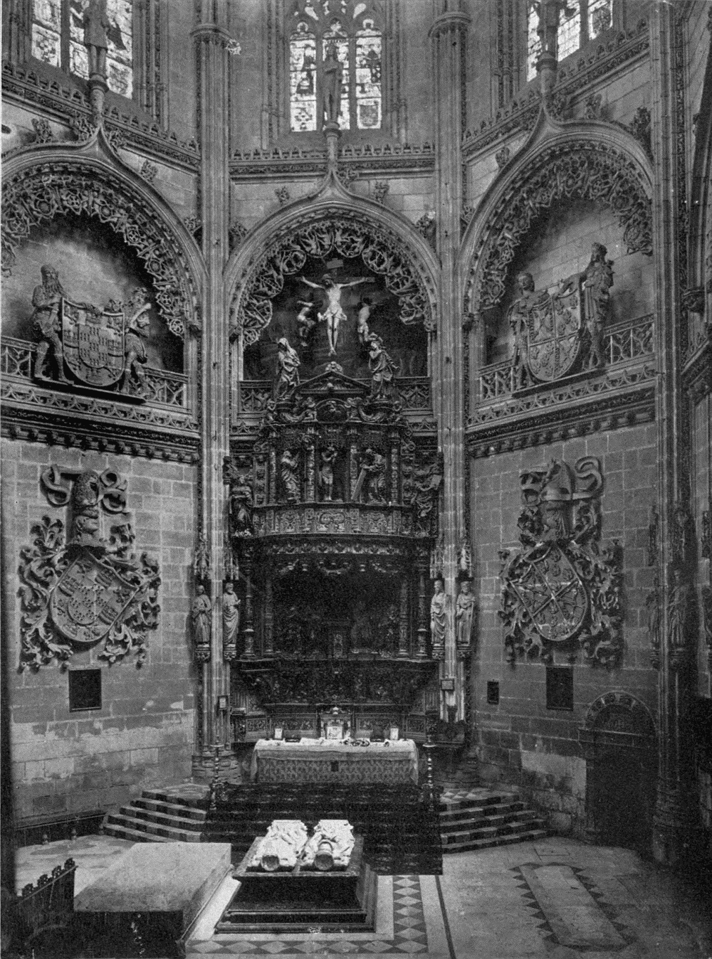 The Royal Chapel, although the oldest part of the building, should be considered last of all, as it is by far the most interesting portion and leaves an impression so vivid as to overshadow all other parts of the great edifice. It is situated between the sagrario and the Sacristia and is entered through the southern arm of the transept. The chapel itself is the very last Gothic efflorescence from which the spirit has fled, leaving only empty form. It consists of a single big nave flanked by lower chapels. The ornamentally{260} ribbed vaulting with gilt bosses and keystones is carried by clustered shafts engaged in its side walls. The shafts are too thin and the capitals too meagre. A broader and more generous string course runs, at the height of the capitals, across the wall surfaces between the upper clerestory and the lower arcades. Portions of this reveal a strong Moorish influence, as the manner in which the great Gothic lettering is employed to decorate the band. Similarly to the invocations to Allah running round the walls of the Alhambra, we read here that "This chapel was founded by the most Catholic Don Fernando and Doña Isabel, King and Queen of the Españos[d], of Naples, of Sicily, and Jerusalem, who conquered this kingdom and brought it back to the faith, who acquired the Canary Isles and Indies, as well as the cities of Ican, Tripoli, and Bugia; who crushed heresy, expelled Moors and Jews from these realms, and reformed religion. The Queen died Tuesday, November 26, 1504. The King died January 25, 1516. The building was completed 1517." Enrique de Egas had, at Ferdinand's order, commenced building two years after Isabella's death. The grandson enlarged it later, finding it "too small for so much glory."