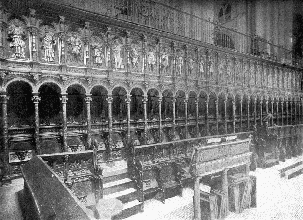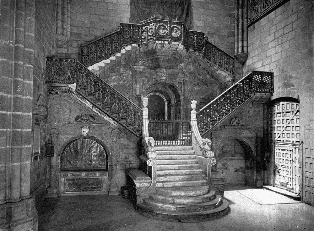 A double superimposed arcade faces the southern side of the sagrario: the lower story has been brutally closed and defaced by modern additions, almost concealing its original carving. The upper story, however, which forms a balcony, strongly recalls by its fancifully twisted shafts, elliptical arches and Gothic traceried balustrade, similar early Renaissance work at Blois, where the Gothic and early Italian work were so charmingly blended.