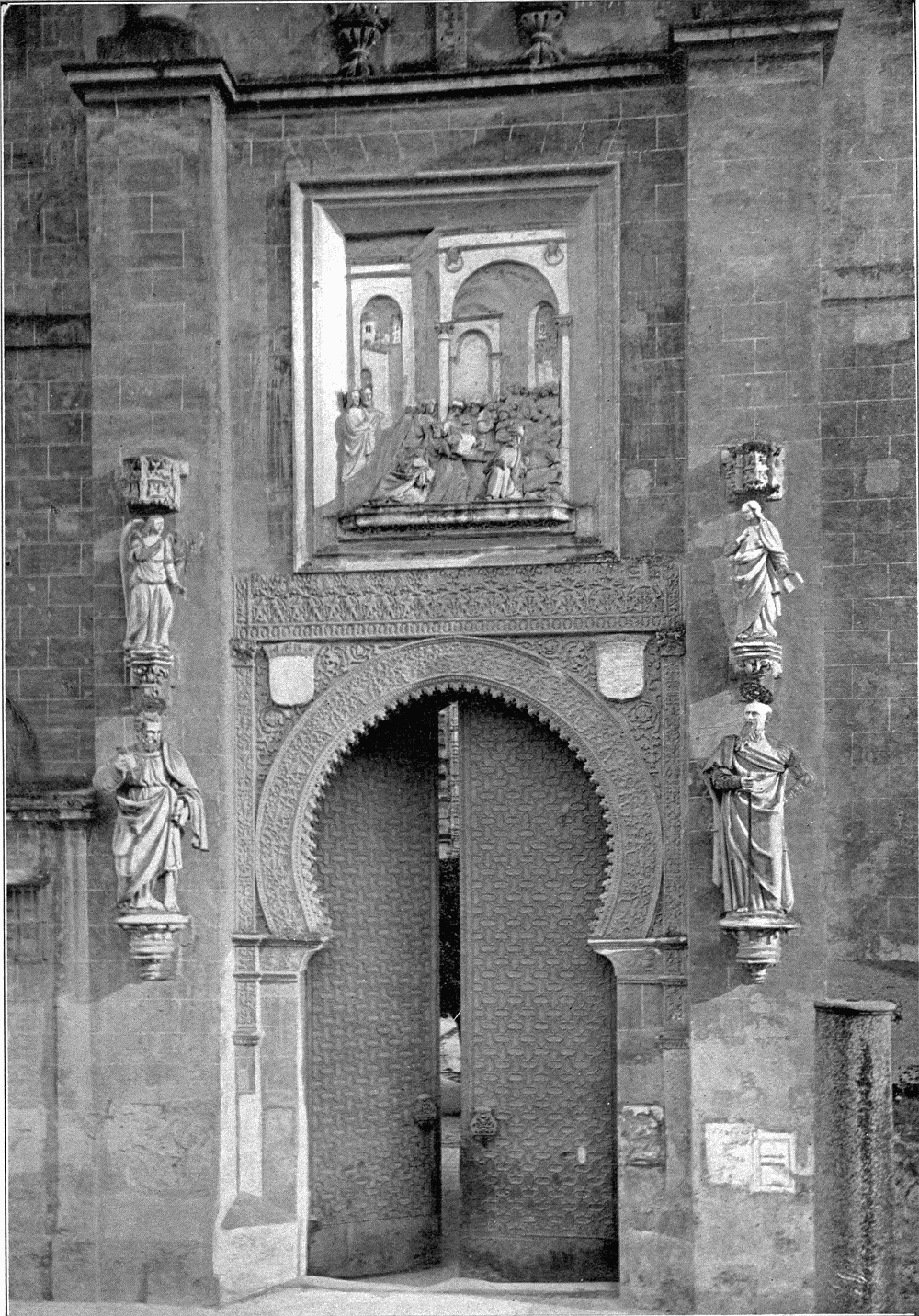 The Capilla del Pulgar, which blocks the most westerly corner of the south elevation, was named in honor of Hernan Peres del Pulgar, the site of whose brave exploit it marks. In 1490, during the last siege of Granada, he determined on a deed which should outdo all feats of heroism and defiance ever performed by Moslem warriors. At dead of night, some authorities say he was on horseback, others that he swam the subterranean channel of the Darro, he penetrated to the heart of the enemy's city and fastened with his dagger to the door of their principal mosque a scroll{256} bearing the words "Ave Maria." Before this insult to their faith had been discovered, he had regained Ferdinand's camp.