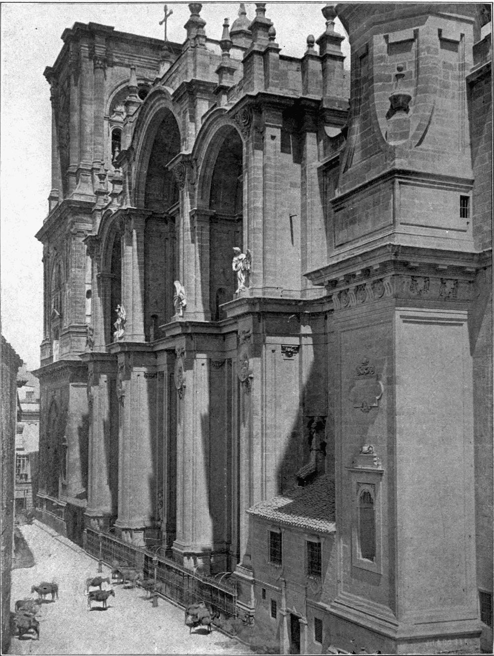 At the period when Gothic church-building was disappearing, we find not a few edifices where the old and new styles are curiously blended. A Renaissance façade added in later days might encase a practically complete Gothic interior. In Granada, with the exception of the Royal Chapel, very little of the interior contained traces of the expiring style. In the Cathedral proper, it is principally found in a groined vaulting of the different bays, which is covered with varying and most elaborate schemes of ornamental Gothic ribs, which seem strangely incongruous to the architect as he looks up from the classical shafts in the expectation of finding a corresponding form of building and decoration in the later vaulting.