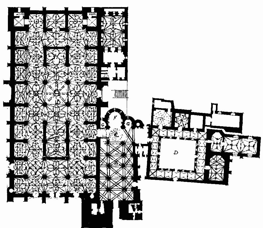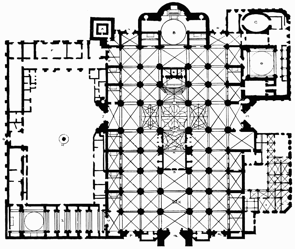 The plan is in general that of the old basilica: a nave with side aisles of five bays, a crossing prolonged one bay to the south beyond the side aisle, while to the east the nave and side aisles all terminate in a semicircular apsidal chapel. A portion of the southern wall of the huge new Cathedral replaces the northern one of the old church by encroaching on its side aisle. A flight of eighteen broad stone steps occupies the northern bay of the old Cathedral's crossing and leads from its considerably lower pavement up to the level of the new one. To the south lie the great cloisters. It was a plan which for its time was undoubtedly as magnificent in scale as it seemed diminutive and insignificant in the sixteenth century when the new Cathedral was built.