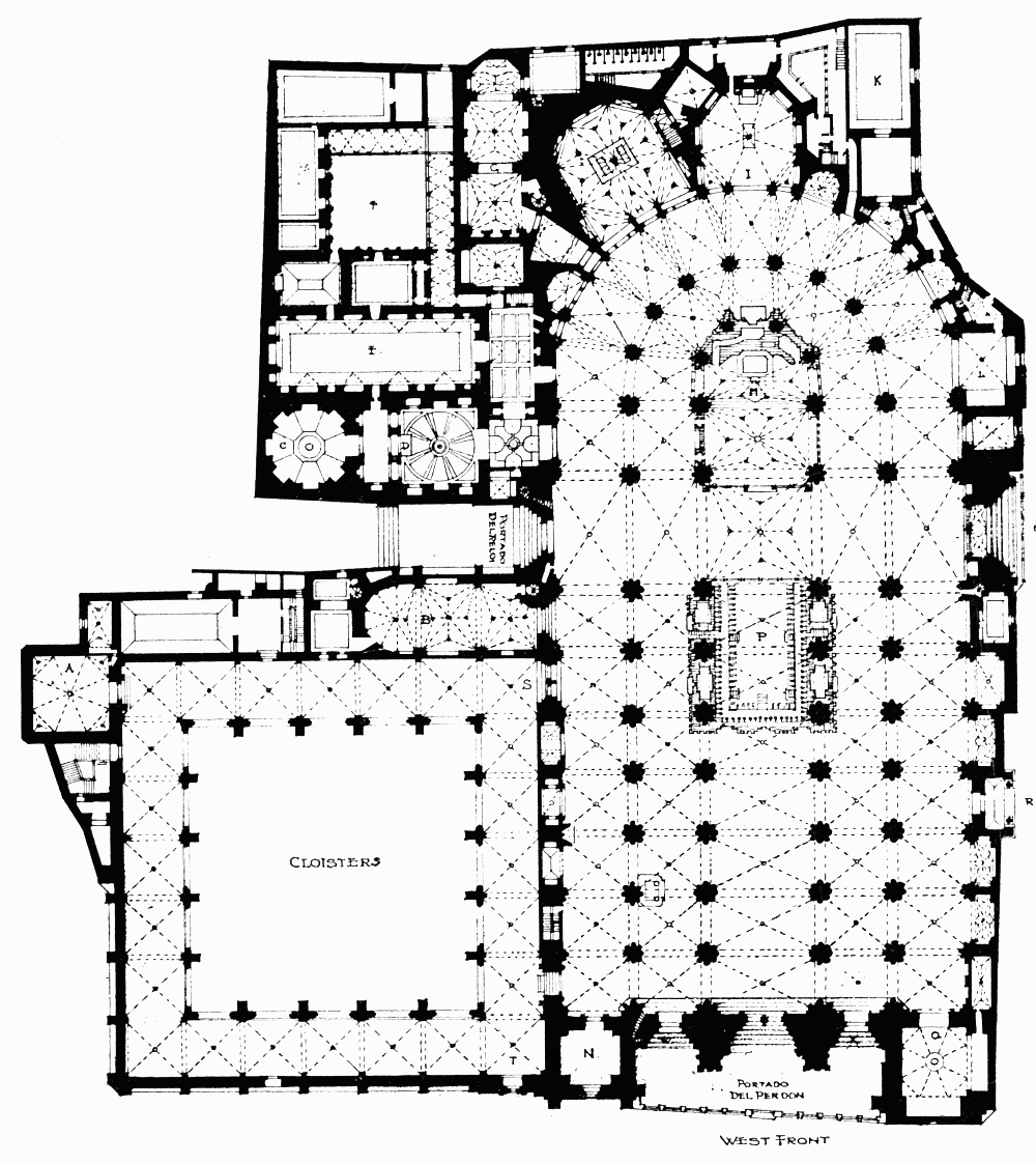The church is divided into nave and double side aisles, outside of which is a series of externally abutting chapels. East and west it contains six bays. The choir blocks up the fifth and sixth bays of the nave, and in the customary Spanish manner it is separated from the high altar in the Capilla Mayor by the croisée of the transept. Back of this, forming the eastern termination, runs an ambulatory.{258}