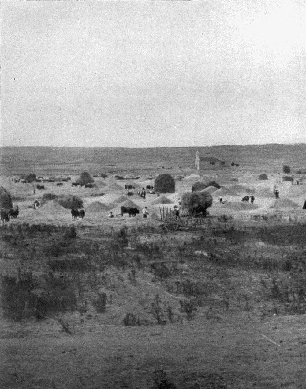 This once famous town lay in a curious setting as seen from the cock-tower in the month of August. Here and there were rusty, copper-colored fields, where the plow had just furrowed the surface. There were vineyards in which the sandy, white mounds were tufted by the deep emerald of the grape-vines, but the prevailing color was the yellow straw of harvested fields. These were a busy scene,—laborers were driving their oxen harnessed to primitive carts and treading out the grain as in olden times. They made their rounds between the high yellow cones built up of grain-stalks and filled the hot air with golden dust.{5}