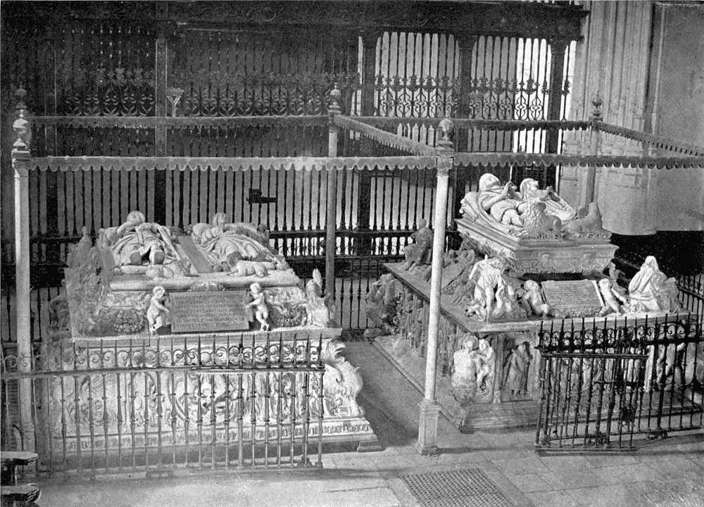 At the foot of the altar, in the centre of the chapel, stand the tombs of Ferdinand and Isabella and of Philip and Joan. They are as gorgeous specimens of sepulchral monuments as the reja is of an ecclesiastical iron screen. Both sarcophagi are executed in the softest flushed alabaster; that of Ferdinand and Isabella by the Florentine Dominico Fancelli; that of their daughter and her son by the Barcelonian Bartolomé Ordenez, "The Eagle of Relief," who carved his blocks at Carrara. The tomb of poor crazy Jane, and the unworthy, handsome husband whom she doted on to the extent of carrying his body with her throughout the doleful wronged insanity of her later years, is somewhat more elevated than that of the Catholic Kings, though its general design is very similar. Philip of Austria sleeps vested with the Order of the Golden Fleece.