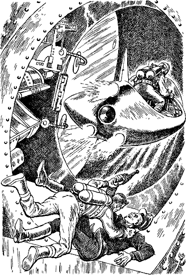 Reluctantly, the little engineer began probing the inner lock with trembling fingers. Minutes later they were easing themselves through, moving slowly down the dark corridor, waiting with pounding hearts for a sound, a sign. The corridor joined another, and then still another, until they reached a great oval door. And then they were inside, in the heart of the ship, and their eyes widened as they stared at the thing in the center of the great vaulted chamber.
