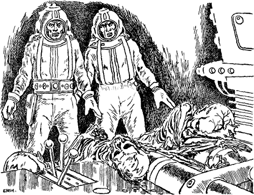 Sabo moved slowly across the room toward the frail, crushed form lying against the great, gleaming panel. Thin, almost boneless arms were pasted against the hard metal; an oval, humanoid skull was crushed like an eggshell into the knobs and levers of the control panel. Sudden horror shot through the big man as he looked around. At the far side of the room was another of the things, and still another, mashed, like lifeless jelly, into the floors and panels. Gently he peeled a bit of jelly away from the metal, then turned with a mixture of wonder and disgust. "All dead," he muttered.
