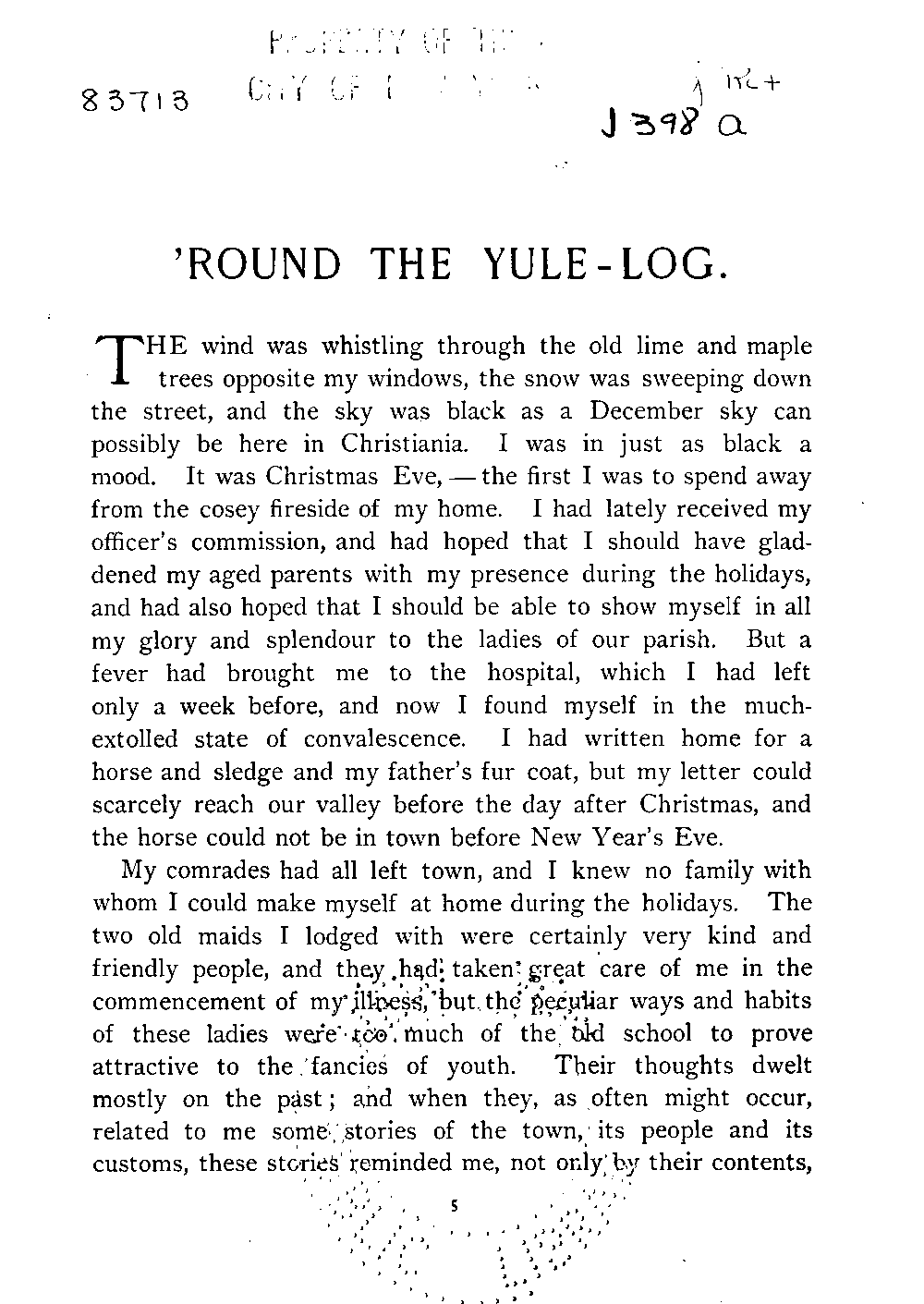 The wind was whistling through the old lime and maple trees opposite my windows, the snow was sweeping down the street, and the sky was black as a December sky can possibly be here in Christiania. I was in just as black a mood. It was Christmas Eve,—the first I was to spend away from the cosey fireside of my home. I had lately received my officer's commission, and had hoped that I should have gladdened my aged parents with my presence during the holidays, and had also hoped that I should be able to show myself in all my glory and splendour to the ladies of our parish. But a fever had brought me to the hospital, which I had left only a week before, and now I found myself in the much-extolled state of convalescence. I had written home for a horse and sledge and my father's fur coat, but my letter could scarcely reach our valley before the day after Christmas, and the horse could not be in town before New Year's Eve.