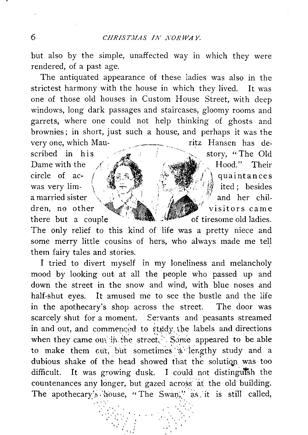 I tried to divert myself in my loneliness and melancholy mood by looking out at all the people who passed up and down the street in the snow and wind, with blue noses and half-shut eyes. It amused me to see the bustle and the life in the apothecary's shop across the street. The door was scarcely shut for a moment. Servants and peasants streamed in and out, and commenced to study the labels and directions when they came out in the street. Some appeared to be able to make them out, but sometimes a lengthy study and a dubious shake of the head showed that the solution was too difficult. It was growing dusk. I could not distinguish the countenances any longer, but gazed across at the old building. The apothecary's house, "The Swan," as it is still called, stood there, with its dark, reddish-brown walls, its pointed gables and towers, with weather-cocks and latticed windows, as a monument of the architecture of the time of King Christian the Fourth. The Swan looked then, as now, a most respectable and sedate bird, with its gold ring round its neck, its spur-boots, and its wings stretched out as if to fly. I was about to plunge myself into reflection on imprisoned birds when I was disturbed by noise and laughter proceeding from some children in the adjoining room, and by a gentle, old-maidish[Page 7] knock at my door.