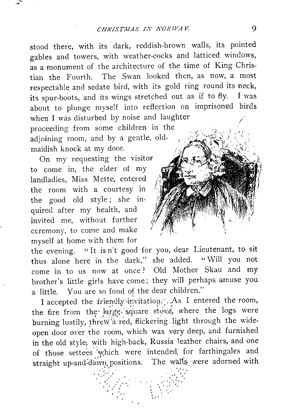 On my requesting the visitor[Page 8] to come in, the elder of my landladies, Miss Mette, entered the room with a courtesy in the good old style; she inquired after my health, and invited me, without further ceremony, to come and make myself at home with them for the evening. "It isn't good for you, dear Lieutenant, to sit thus alone here in the dark," she added. "Will you not come in to us now at once? Old Mother Skau and my brother's little girls have come; they will perhaps amuse you[Page 9] a little. You are so fond of the dear children."