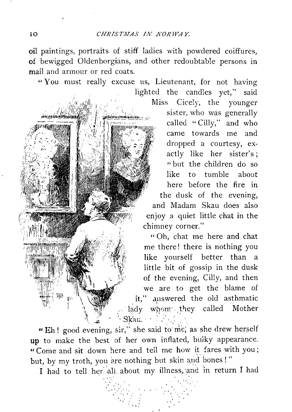 "You must really excuse us, Lieutenant, for not having lighted the candles yet," said Miss Cicely, the younger sister, who was generally called "Cilly," and who came towards me and dropped a courtesy, exactly like her sister's; "but the children do so like to tumble about here before the fire in the dusk of the evening, and Madam Skau does also enjoy a quiet little chat in the chimney corner."